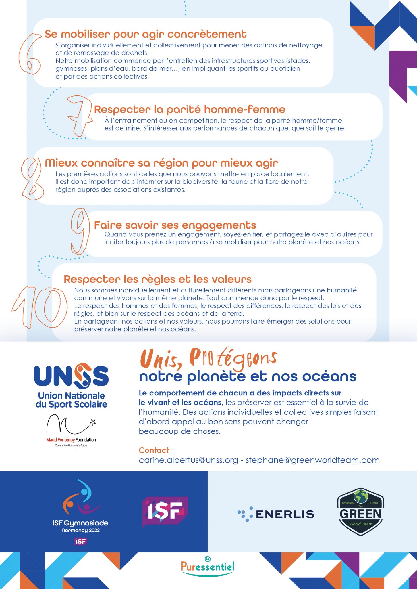 éco-responsables des sportifs et sportives sera également créé, en lien avec la jeunesse. Green World Team a aussi prévu une grosse communication, sur ses réseaux sociaux et ceux des Gymnasiades, auprès des lycéens présents. TikTok est d’ailleurs au coeur de la stratégie, avec des vidéos challenge, de conseil ou de sensibilisation notamment. Aussi, les éco-délégués de l’UNSS ont élaboré un document autour de 10 engagements à l’occasion des Gymnasiades, que vous pouvez retrouver ci-dessous.
