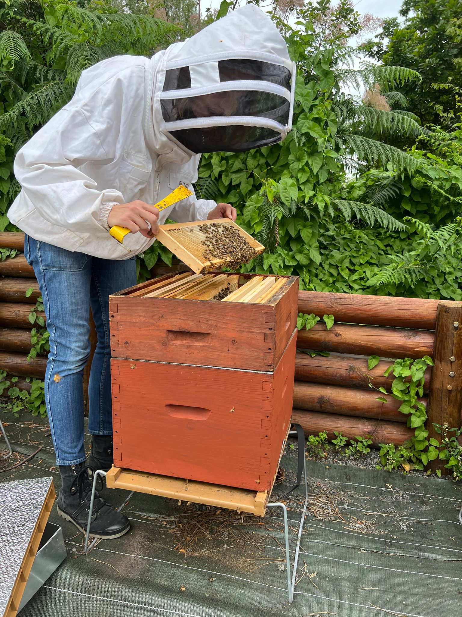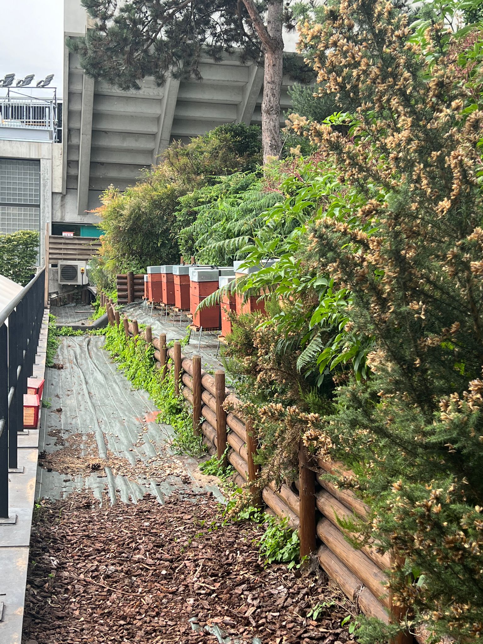 Le plus étonnant est un sujet qui a consacré près d’une heure de la visite : les ruches de Roland-Garros. Logées derrière une petite butte aux abords du Lenglen, entre deux nichoirs à oiseaux, cinq ruches sont entretenues par la compagnie MUGO et produisent une certaine quantité de miel vendus sous l’étiquette « Miel de Roland-Garros ». Au-delà de cette production, l’introduction de ruches en plein cœur d’un écrin de nature favorise la pollinisation des espaces verts et ouvre de nouvelles perspectives en terme de biodiversité.”